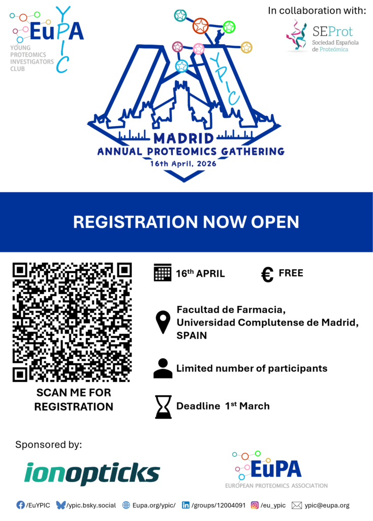 We are thrilled to announce that the YPIC Annual Proteomics Gathering is coming back for its 3rd edition on April 16th, 2026 at the Facultad de Farmacia, Universidad Complutense de Madrid! It is a free event made possible by our kind sponsors (EuPA and IonOpticks), where the YPIC team connects to the local proteomics community to network, share and discuss cutting-edge proteomics research.